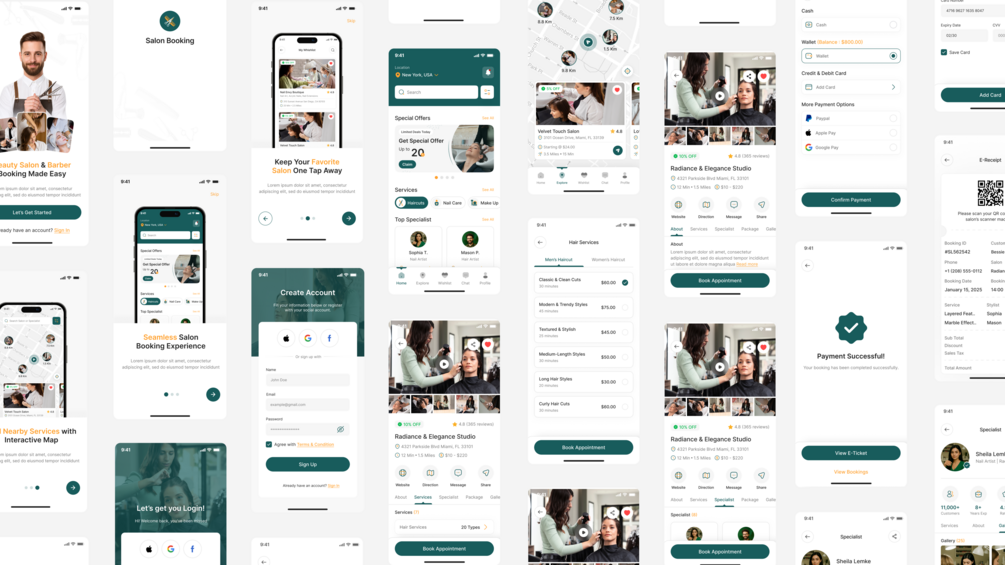 -Salon Detail - About, Salon Detail - Services, Hair Services, Salon Detail - Specialist, Salon Detail - Package, Salon Detail - Gallery, Salon Detail - Review Screens
